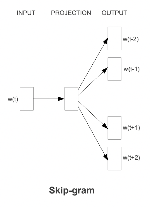 예를 들어 "The fat cat sat on the mat" 이라는 문장에서 “sat”이라는 중심 단어를 log-linear classifier에 input으로 입력하면 “fat”, “cat”, “on”, “the” 의 output을 도출합니다. 중심 단어에 대해서 주변 단어를 예측하므로 projection layer에서 벡터들의 평균을 구하는 과정은 없습니다.