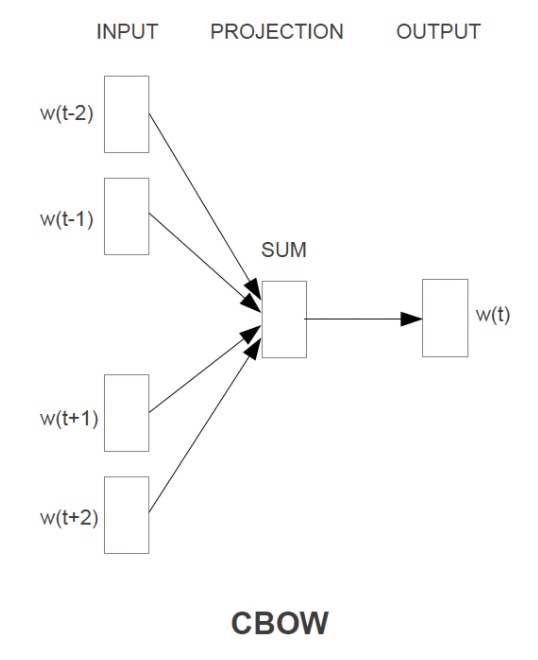 해당 architecture는 feedforward NNLM과 유사하지만, hidden layer가 제거되면서, projection layer가 모든 단어들과 공유됩니다. 또한, 전체 word vector의 평균값(bag-of-words)을 사용하기 때문에 단어의 순서가 projection에 영향을 주지 않습니다.