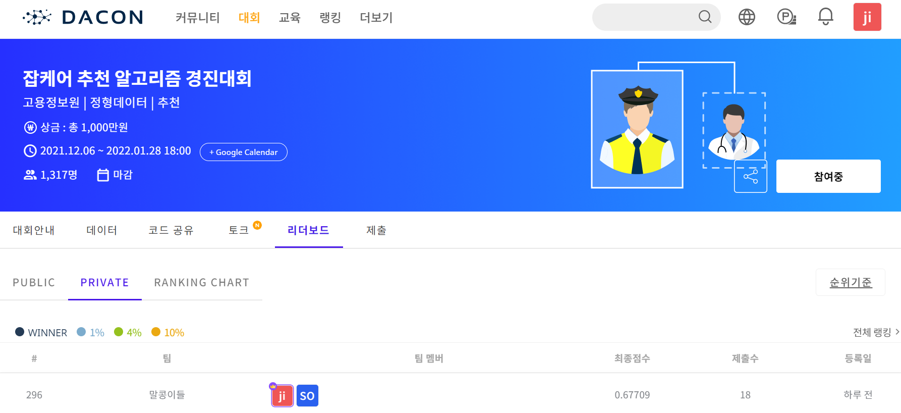 Private 296위로 22%에 들었다. 첫 데이콘 공모전이라서 아쉬움도 남았지만 수고했다!