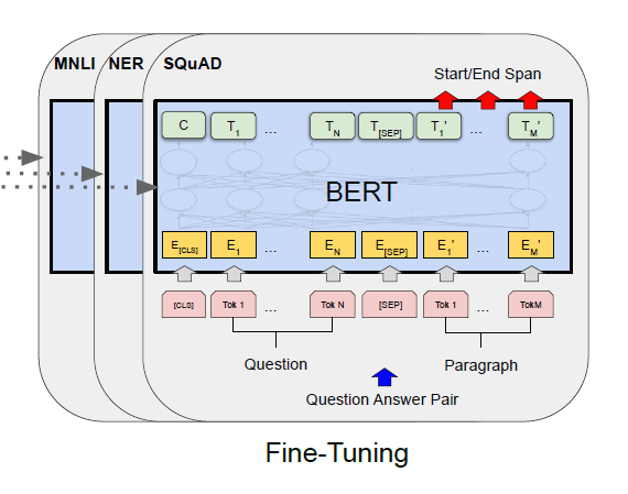각 task에서 task specific 한 입력과 출력을 BERT에 대입하고 모든 모수를 end-to-end로 바꿔줍니다. 입력에서 사전학습된 sentence A와 B는 Paraphrasing, Inference, QA, classification, tagging에 사용됩니다. 출력에서, 토큰은 tonken-level task인 tagging과 QA을 위한 출력 레이어에 들어가고, [CLS]는 classification을 위한 출력 레이어에 들어갑니다.