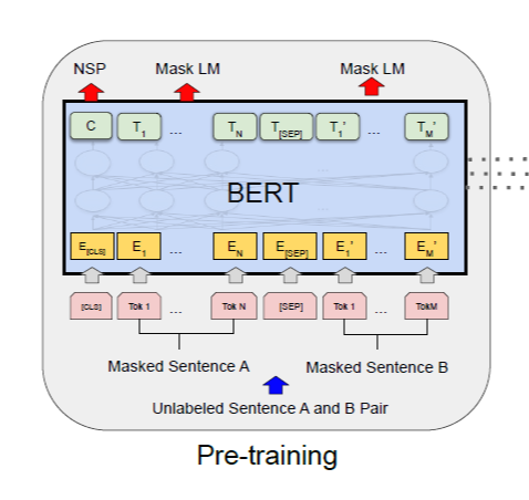 left-to-right 나 right-to-left 언어 모델을 사용하는 대신 BERT는 두 개의 unsupervised task를 사용합니다. 먼저 사전학습(Pre-training)에 대해서 설명하겠습니다.