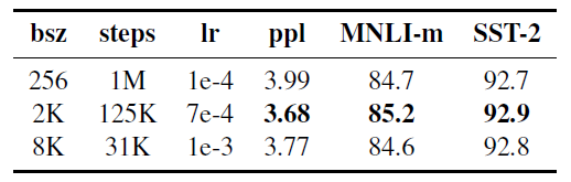 표에서 BERT base로 배치사이즈를 증가하면서 Perplexity와 성능을 비교결과를 보여줍니다. 큰 배치로 학습하는 것은 Perplexcity를 개선하고 정확도를 올립니다. 또한 큰 배치들은 분산 데이터 병렬 학습을 통해 병렬화하기 더욱 쉽다고 합니다.