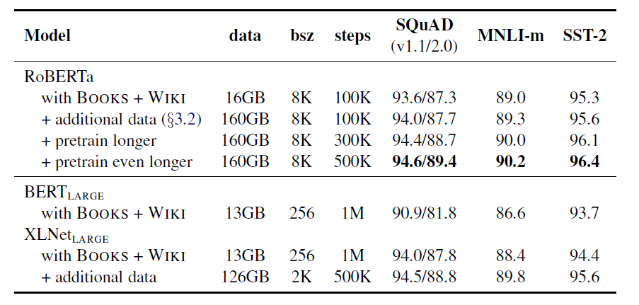 이전 섹션에서 성능을 올리기 위한 BERT의 개선에 대해서 소개했습니다. 앞선 개선을 종합한 모델이 Robustly optimized BERT approch인 RoBERTa입니다. 구체적으로, RoBERTa는 동적마스킹(dyamic masking), NSP loss를 사용하지 않는 FULL - SENTENCES, 큰 미니 배치(mini-batches), larger byte-level BPE를 사용합니다. 추가적으로 이전 연구들에서는 과소평가되었지만 중요한 2가지 요소를 고려합니다. 1) 사전학습에 사용되는 데이터, 2) 훈련 횟수(number of training pass)