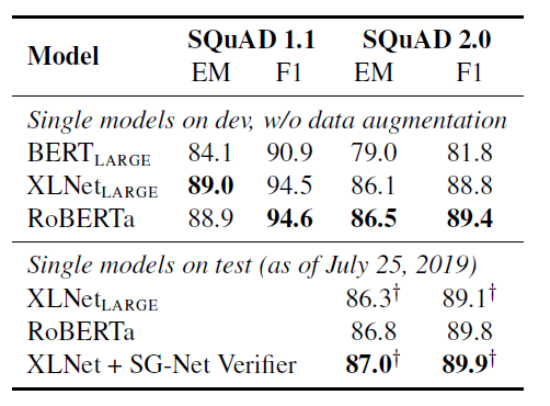 SQuAD v1.1에서 XLNet이 SOTA이지만 SQuAD v2.0에서 RoBERTa가 새로운 SOTA를 달성합니다.
