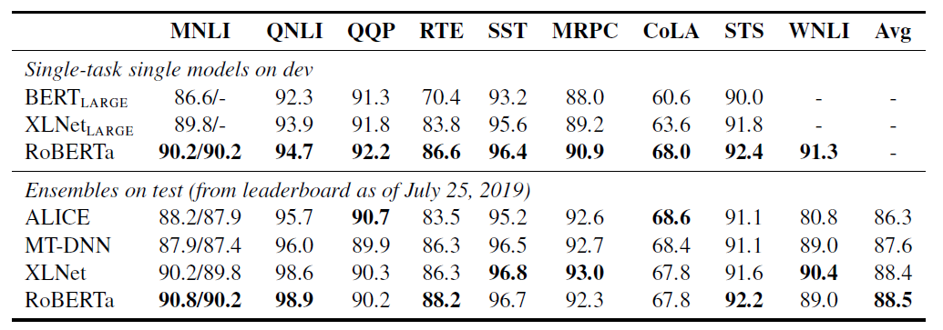두번째 ensemble의 경우 4개의 태스크에서 SOTA를 달성하고 가장 높은 평균 스코어를 가졌습니다. 다른 상위 제출 모델과 다르게 RoBERTa는 multi-task 파인튜닝에 의존하지 않습니다. 다음 연구에서 multi-task 파인튜닝을 통해 성능을 개선할 것을 기대합니다.