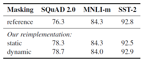 BERT는 랜덤하게 마스킹하고 토큰을 예측하는 것에 의존합니다. 기존의 BERT는 데이터 전처리 과정에서 한번 마스킹을 시행합니다. 즉 single static mask입니다. 각 에포크마다 같은 마스크를 사용하는 것을 방지하기 위해서 학습데이터를 10번 복제되고, 40 에포크 동안 각 시퀀스는 10개의 다른 방법으로 마스킹됩니다. 따라서 각 학습 시퀀스는 같은 마스크를 4번 볼 수 있습니다.