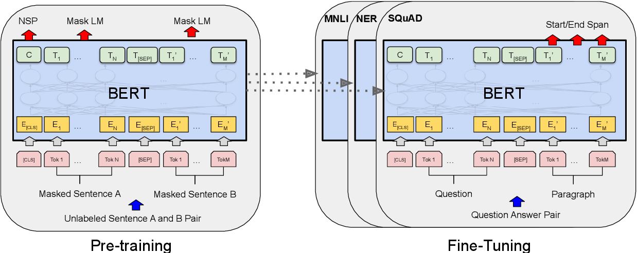 BERT는 두 segment와 특별 토큰(special tokens)결합을 입력으로 합니다. 여기서 segment는 하나 이상의 자연어 문장으로 구성됩니다. : [CLS], x_1, .... x_N, [SEP], y_1, ... y_M, [EOS]. (M + N < T , T는 최대 시퀀스 길이를 나타내는 모수). 모델은 먼저 라벨링 되지 않은 큰 텍스트 코퍼스에서 사전학습(pretrained)되고 그 후 end-task 라벨링 데이터를 사용해 파인튜닝(finetuned)됩니다.