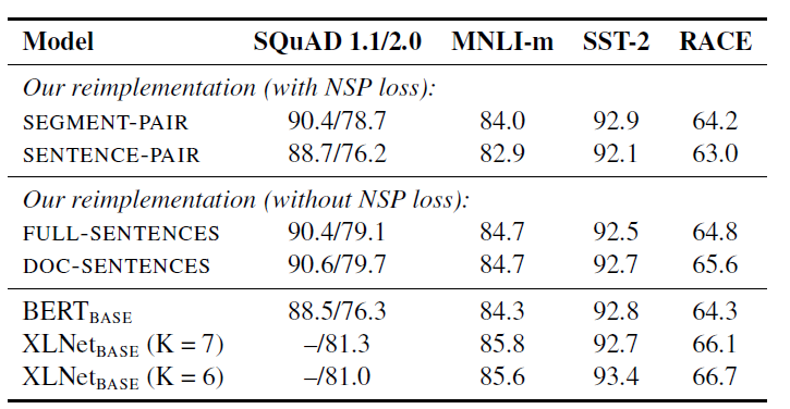 - SEGMENT-PAIR + NSP: 기존 BERT에서 사용한 입력값과 동일한 설정입니다. NSP Loss를 사용합니다. 각 입력의 segment는 multiple natural sentences를 가질수 있지만 합쳐진 총 길이는 512개 이하의 토큰 이여야합니다.